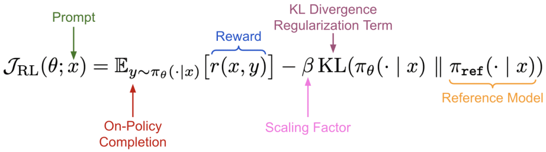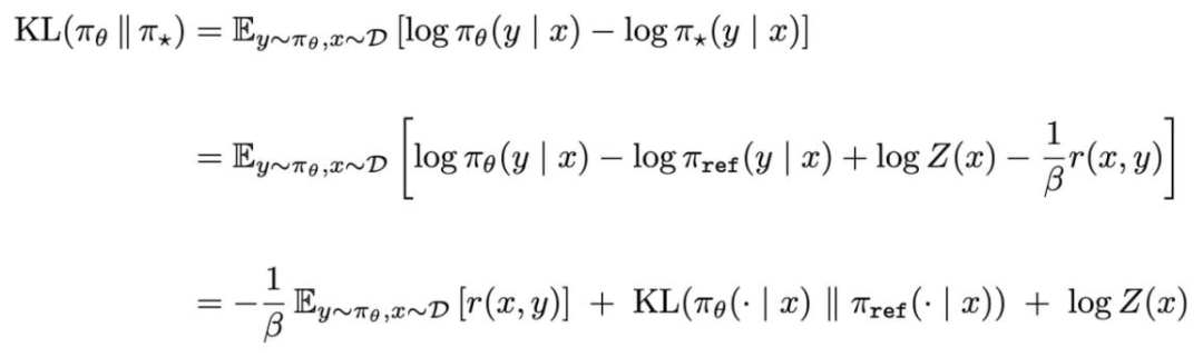 可见,该等式第一行计算的反向 KL 散度,与我们推导监督微调目标时所用的 KL 散度相对。最后一行是强化学习目标的负值(外加 1/β 的缩放因子与额外常数)。因此,最小化该反向 KL 散度目标与最大化强化学习训练目标等价。
