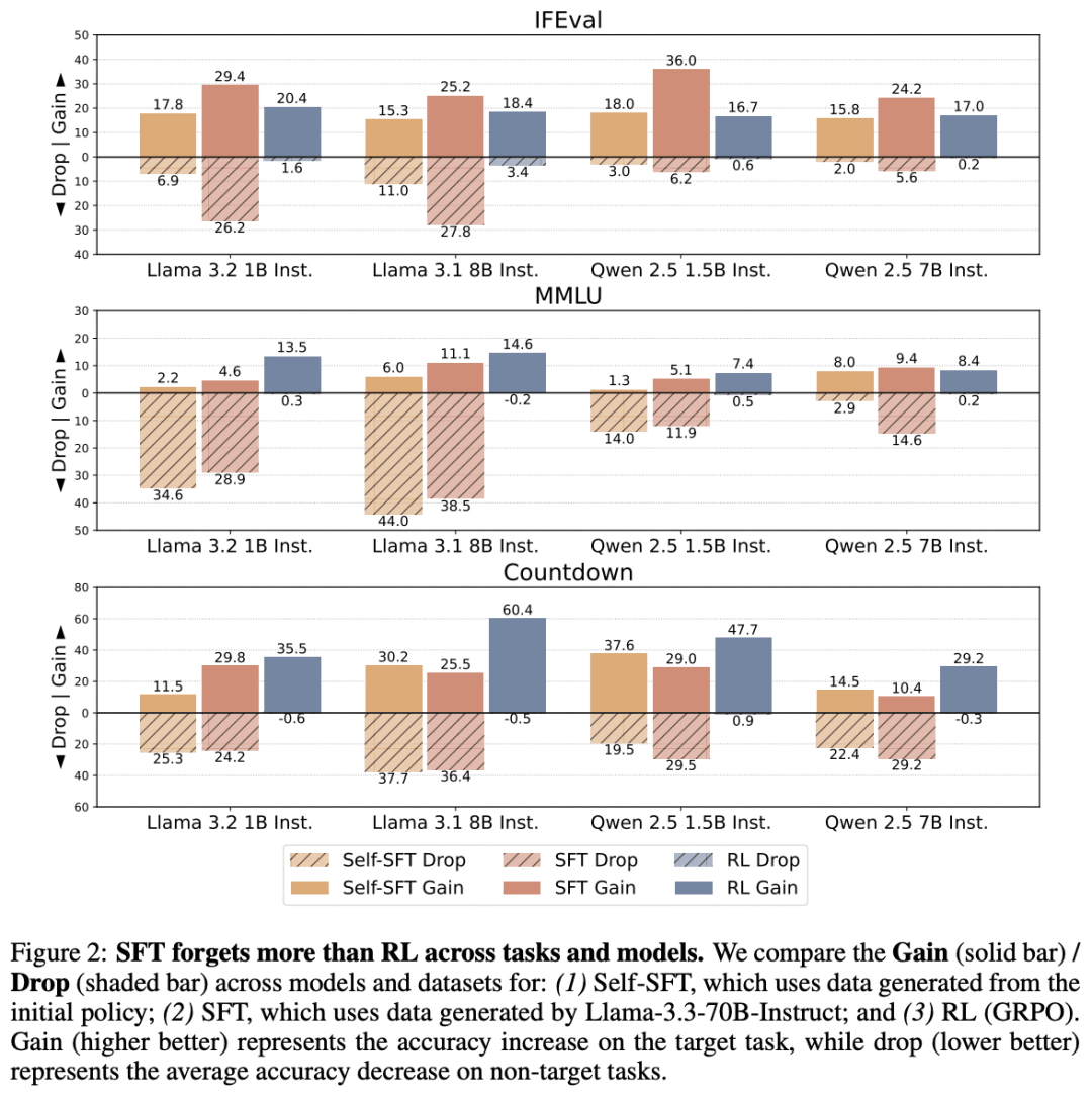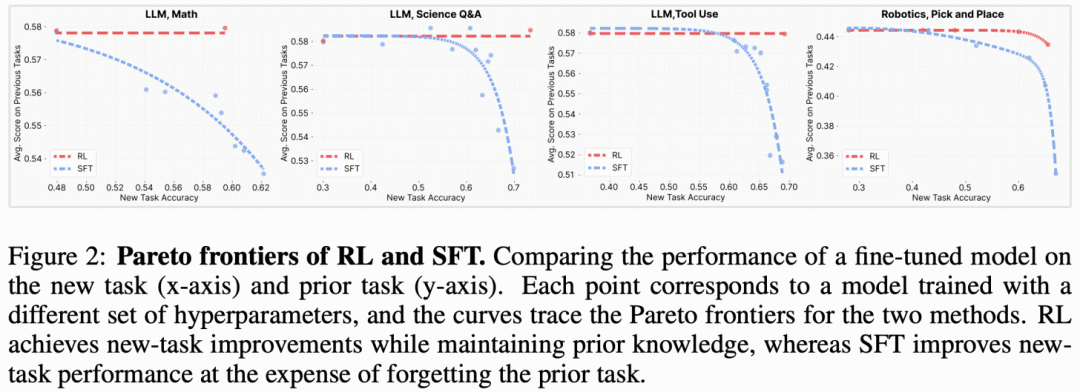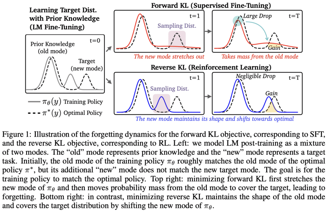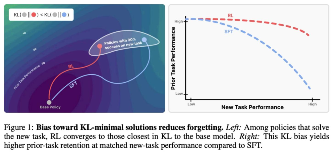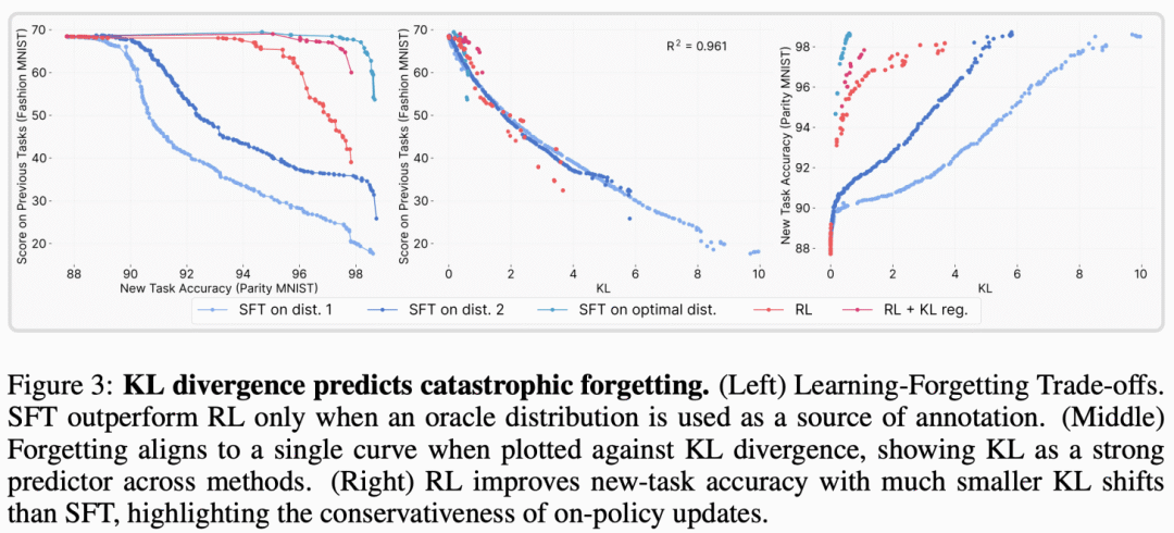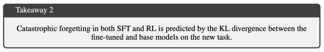 我们已知,监督微调和强化学习在新任务上训练能达到相当表现,但遗忘动态却截然不同。多数情况下,监督微调在新任务上的提升以抹去先验知识为代价,而强化学习则更擅长保护旧有能力,如下所示。通过研究这一表现差距,文献 [3] 的作者找到一个能可靠预测监督微调和强化学习遗忘程度的指标:基础模型与微调模型在目标任务上的分布偏移 —— 以 KL 散度衡量。