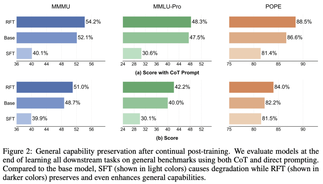 持续后训练过程结束后,在所有已接触任务的测试集上计算上述指标。此外,文献 [1] 的作者还在持续后训练结束时,测量模型在多个通用大语言模型基准(如 MMMU、MMLU-Pro、POPE)上的表现,以检查对模型通用能力的影响。