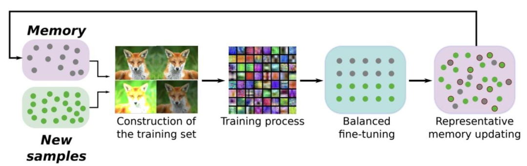 回放机制(上图所示)是一种简单有效的持续学习技术,通过维护先验数据缓冲区供模型训练使用。样本加入回放缓冲区前,通常会经过筛选(如基于重要性或多样性)[14],以确保缓冲区包含高质量、有代表性的样本,且体积不会过大。整个回放缓冲区也可进行量化或压缩以减少内存占用 [15]。在无法将数据显式存储在回放缓冲区的场景中,我们还可训练或维护一个生成式代理,来回放合成样本 [16, 17]。
