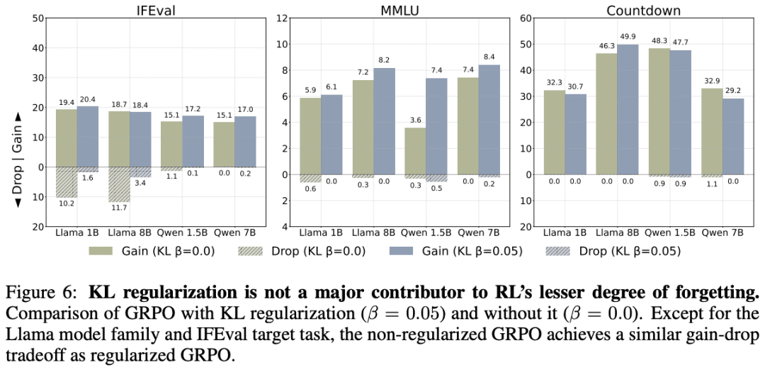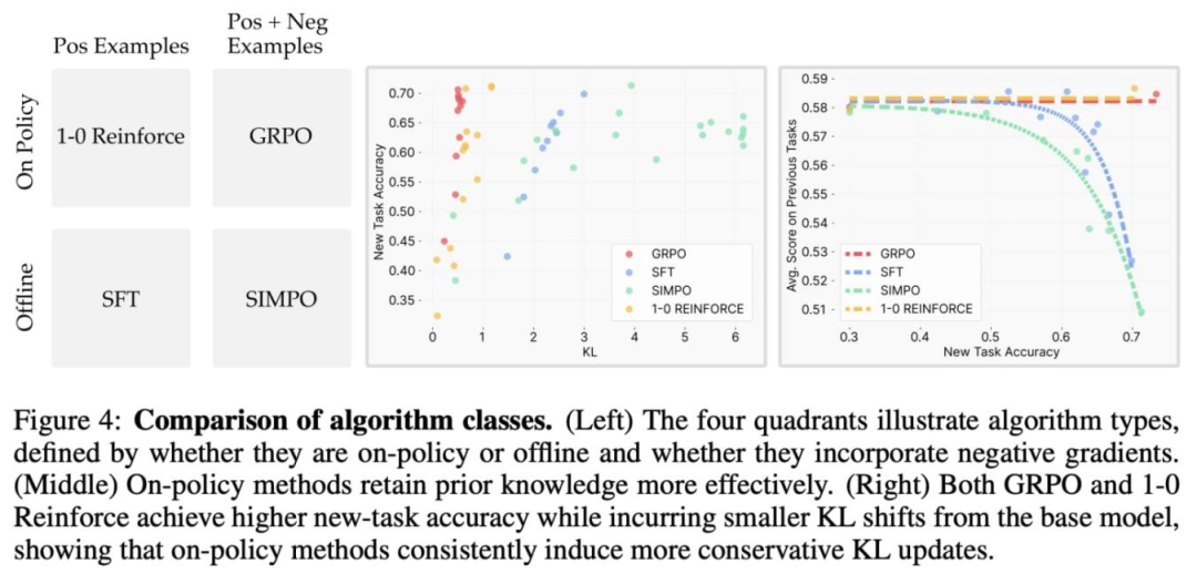 可见,上图左半部分实验在训练设置中剔除了负样本与在线策略数据。有趣的是,0-1 强化算法表现与分组相对策略优化相近,而简单偏好优化结果与监督微调相似。这些结果表明,在线策略数据的使用是强化学习遗忘少的关键原因。上图还显示,使用在线策略数据能让基础模型与微调模型在目标分布上的 KL 散度最小。这些结果表明,强化学习对低 KL 解决方案的隐式偏向源于训练的在线特性。文献 [3] 中的进一步理论分析也从实证上验证了这一观察。