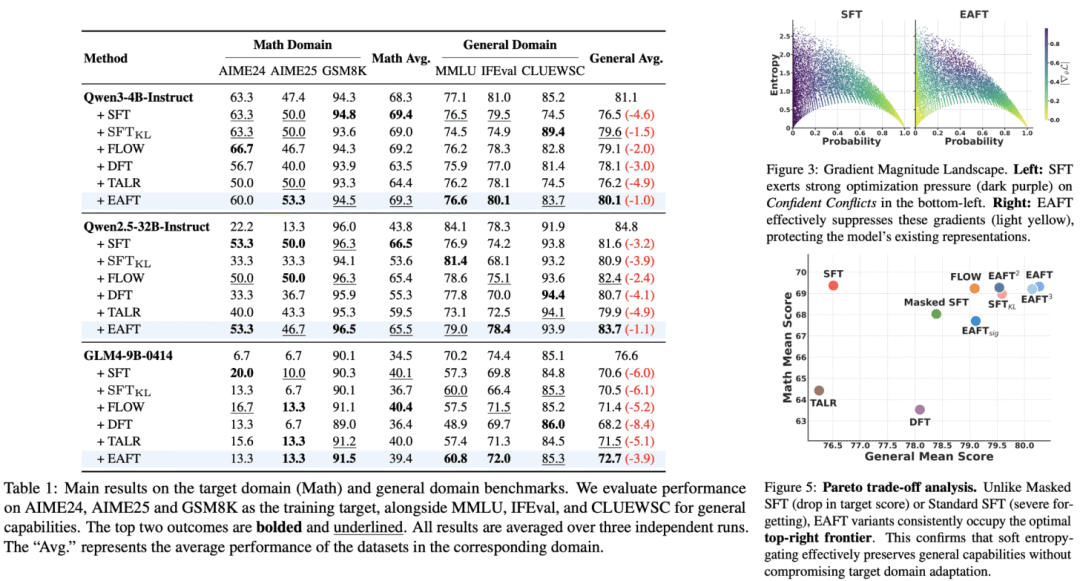 数学领域结果熵自适应微调在数学领域通过多个系列、参数量 40 亿至 320 亿的模型得到验证。训练提示来自 NuminaMath、BigMathVerified 与 Nemotron-CrossThink,补全结果采样自 Qwen-3-235B-A22B-Instruct。评估同时使用域内与通用基准。熵自适应微调训练的模型在目标领域表现良好,同时维持通用基准上的表现,如下所示。此外,实验证实熵自适应微调能在训练过程中有效过滤置信冲突样本,下图置信冲突区域内的梯度幅度明显下降。医学与工具使用领域的实验也进一步验证了这些结果。