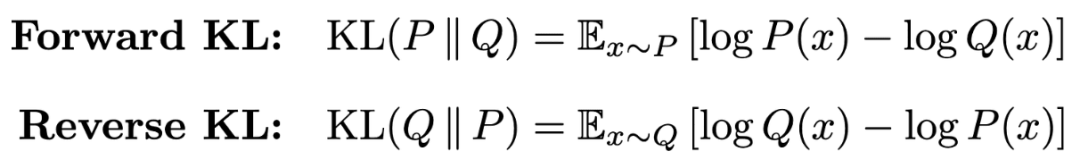 前向与反向 KL 散度我们可以通过与 KL 散度的关系来理解监督微调和强化学习的训练目标。形式化来说,KL 散度是衡量两个概率分布差异的指标,完整说明见此处。对于两个概率分布 P 和 Q,我们可定义前向与反向 KL 散度,如下图所示。