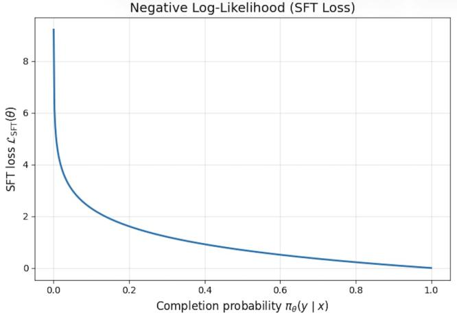 训练目标监督微调中,我们拥有固定的监督样本数据集,用于训练大语言模型。训练目标旨在最小化模型在该数据集上的负对数似然,如下所示。