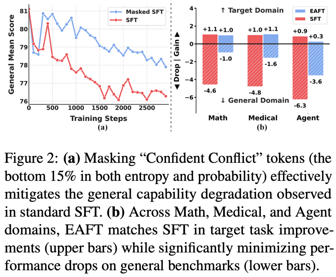 屏蔽冲突为验证置信冲突词元是否真的会导致遗忘,文献 [6] 的作者测试在监督微调中直接屏蔽这类词元的损失。有趣的是,将这些词元从训练损失中屏蔽后,灾难性遗忘显著减少,表明置信冲突词元是监督微调破坏先验知识的重要因素,如下所示。