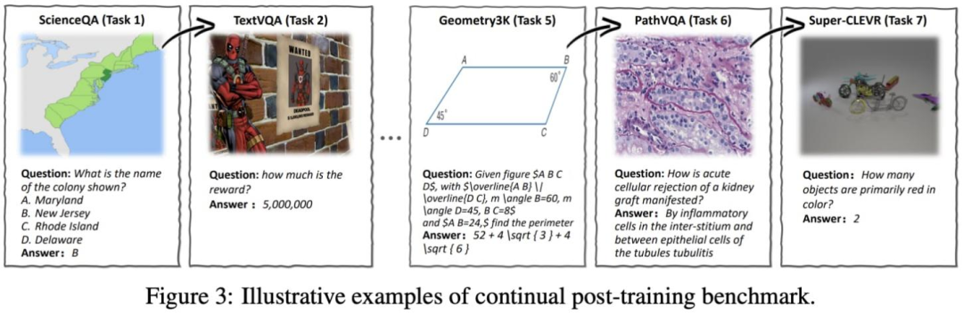 持续后训练现实世界中,持续学习十分复杂—— 大语言模型会不断接触来自各种来源的新数据 —— 但研究需要更规整的替代设置。模拟持续学习的常用方法是采用序列学习(或批次增量)设置,即让大语言模型依次接触一组有序数据集。文献 [1] 中,作者选取七个覆盖多模态(视觉)场景的数据集:ScienceQA、TextVQA、VizWiz、Geometry3K、GQA、PathVQA 与 Super-CLEVR。