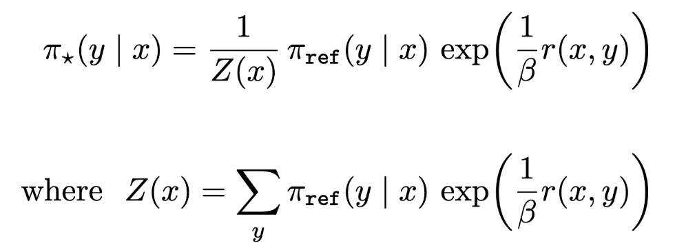 强化学习≈ 反向 KL 散度如前所述,强化学习试图最大化在线策略补全结果的奖励,同时最小化与参考策略的 KL 散度。我们实际上可以推导出强化学习目标最优解的闭式表达式。最优策略表达式如下,其中 Z (x) 表示配分函数。值得注意的是,这一最优策略表达式也是推导直接偏好优化训练损失的第一步!