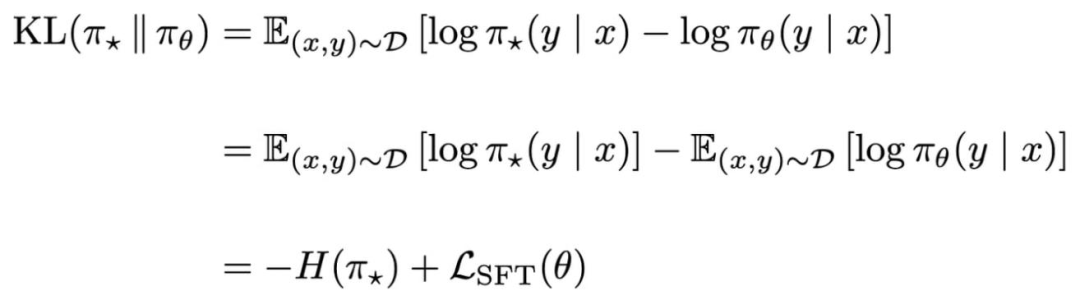 监督微调≈ 前向 KL 散度基于这些概念,我们可以证明监督微调所用的训练目标与前向 KL 散度仅相差一个常数。我们将数据集的最优(或目标)分布记为 π_。可以推导出该目标与前向 KL 散度的关系,其中 H (π_) 表示监督微调数据集上最优分布的熵。
