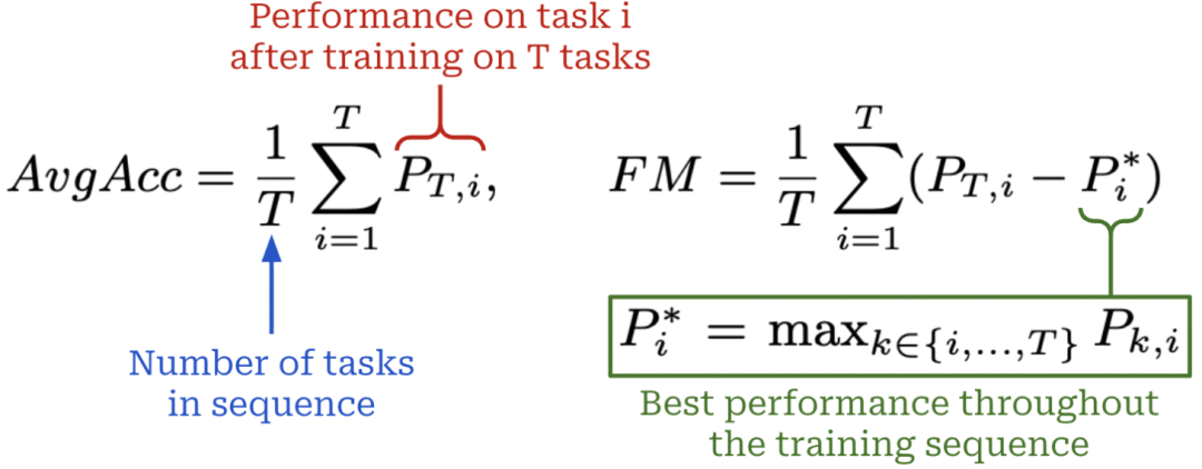 “平均准确率越高代表整体表现越好,遗忘度量越接近零代表遗忘越少、知识保留效果越好。”—— 引自 [1]