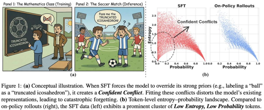 “强化学习与模型内部信念保持一致,而监督微调则强迫模型拟合外部监督信号。这种不匹配常表现为置信冲突—— 即低概率、低熵的词元。”—— 引自 [6]