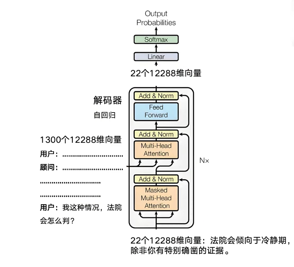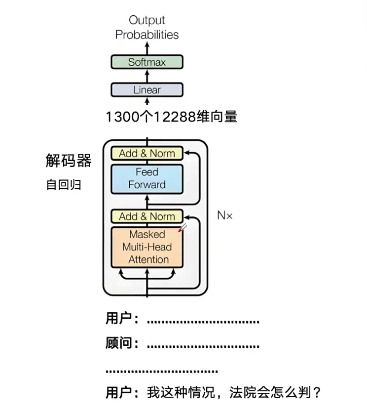 2、在纯解码器架构中,由于不存在独立的编码器,也就没有了那组固定的“1300个输入向量”作为参照。因此,解码器不再需要传统意义上的 “编码器-解码器融合层” 。它无需去比对两组不同的信息源,而是完全专注于自回归生成–即仅依靠已生成的文本片段,通过内部的注意力机制,一步步预测并输出下一个词。