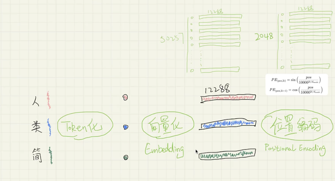 随后为了弥补自注意力机制缺乏顺序感知的缺陷,我们需要加入位置编码,虽然早期的位置编码基于固定的数学公式,但现代模型将其变为可学习的参数,GPT-3 支持 2048 长度的上下文,因此有 2048 个对应的位置向量,我们将第一个 Token 向量加上“位置1”的向量,第二个加上“位置2”的向量,以此赋予模型对顺序的理解;