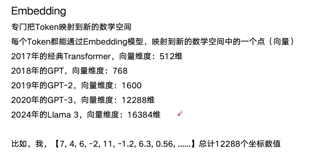 前面的两个步骤,GPT会把这段对话中的650个字,转换成大概1300个Token,然后再把1300个Token变成1300个Embedding向量,每个向量12288维。