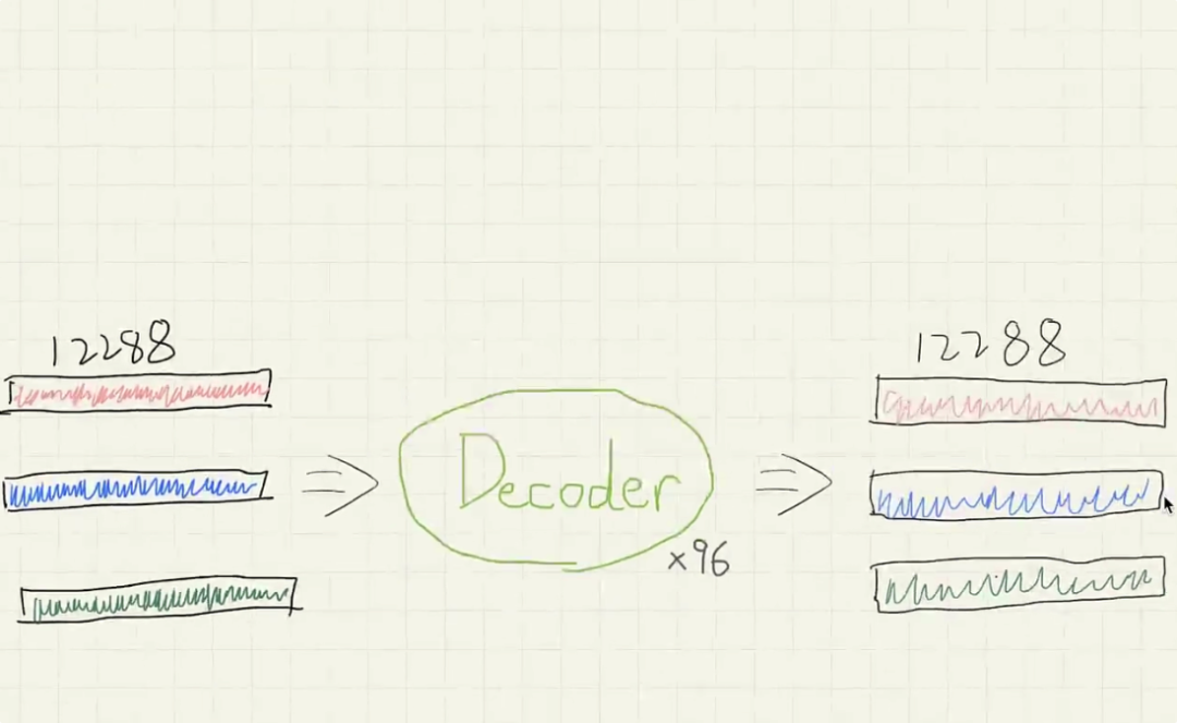 紧接着这 3 个携带位置信息的向量进入由 96 层组成的解码器进行深度的信息聚合(虽然只有 3 个向量且 96 轮计算显得有些“杀鸡焉用牛刀”),经过层层复杂运算,输入是 3 个向量,输出依然是 3 个向量,但其中最后一个向量已经通过历史视角聚合了最丰富的上下文语义信息;
