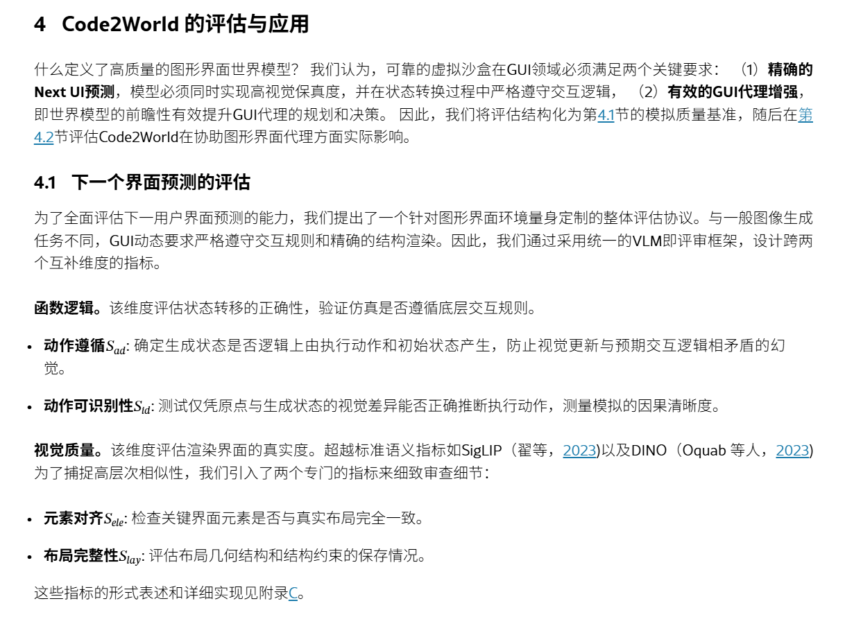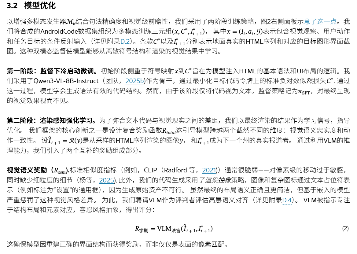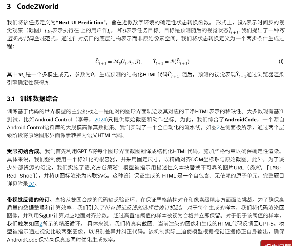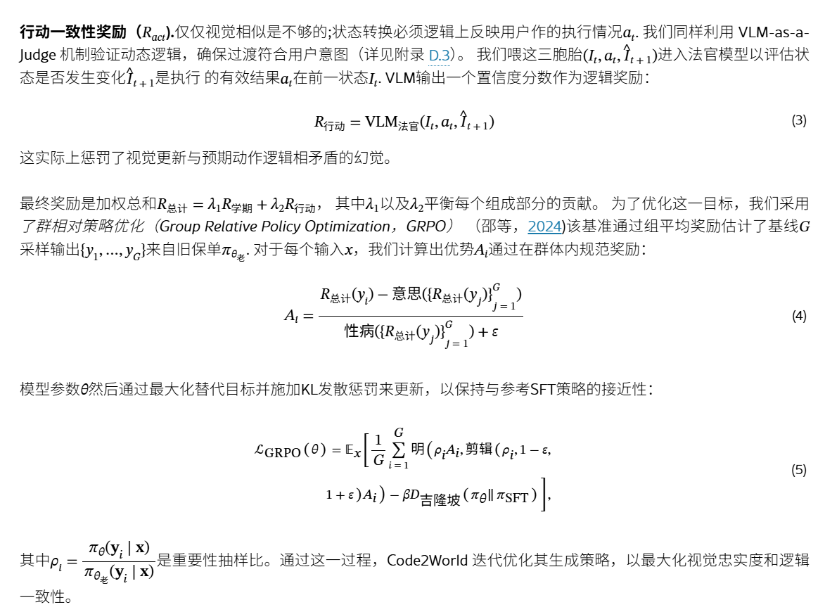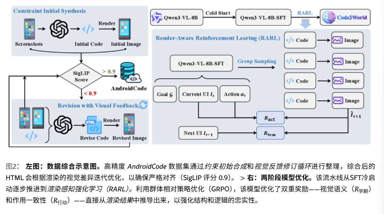 问题:实现 高视觉真实度和细粒度结构控制方面 困难贡献:提出了Code2World,一种视觉语言编码器,通过可渲染的代码生成模拟下一个视觉状态。构建数据集SFT+RL:对SFT进行冷启动,随后进行格式布局,然后进一步应用渲染感知强化学习,通过强制执行视觉语义忠实性和动作一致性,将渲染结果作为奖励信号结果:Code2World-8B 下一个UI预测好。与 GPT-5和Gemini-3-Pro-Ima