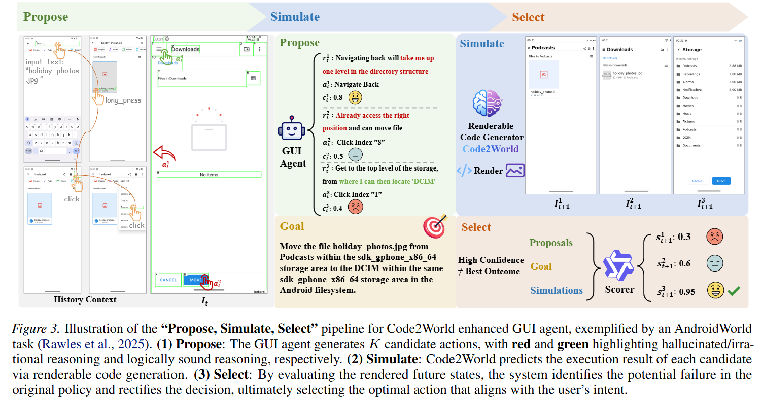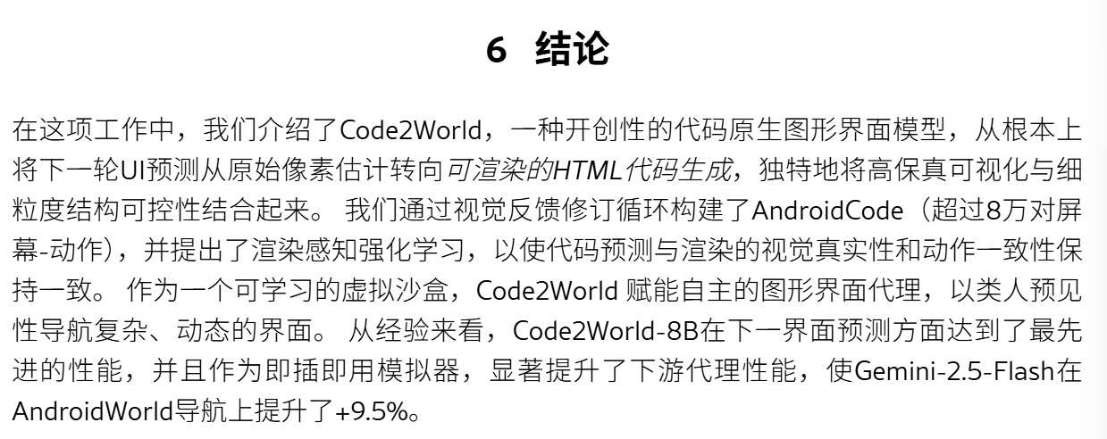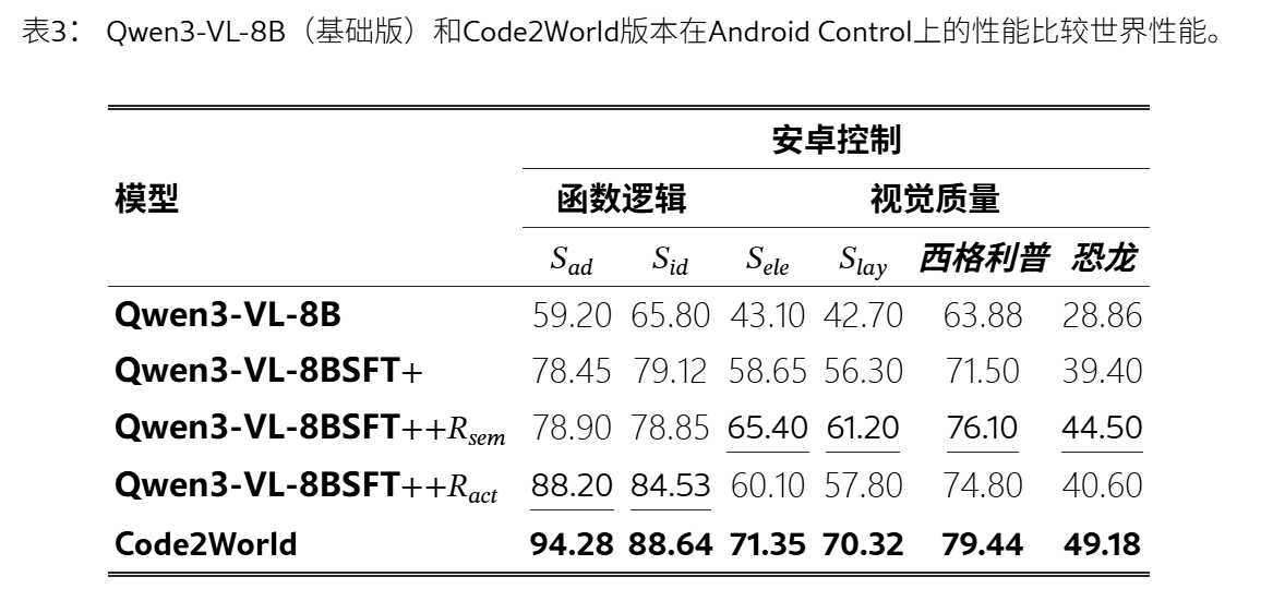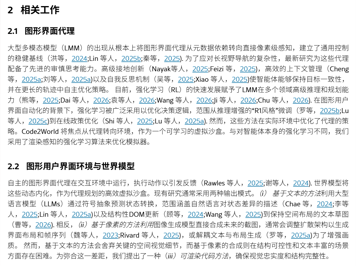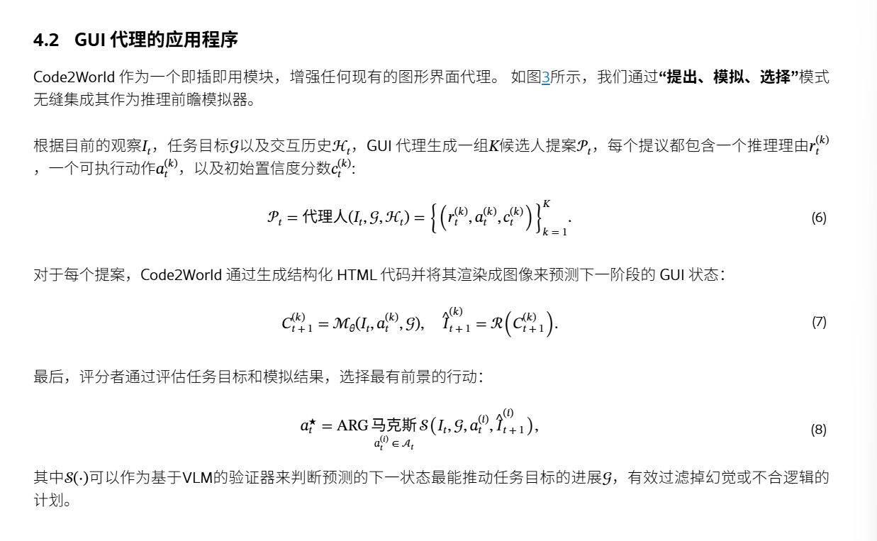 问题:实现 高视觉真实度和细粒度结构控制方面 困难贡献:提出了Code2World,一种视觉语言编码器,通过可渲染的代码生成模拟下一个视觉状态。构建数据集SFT+RL:对SFT进行冷启动,随后进行格式布局,然后进一步应用渲染感知强化学习,通过强制执行视觉语义忠实性和动作一致性,将渲染结果作为奖励信号结果:Code2World-8B 下一个UI预测好。与 GPT-5和Gemini-3-Pro-Ima