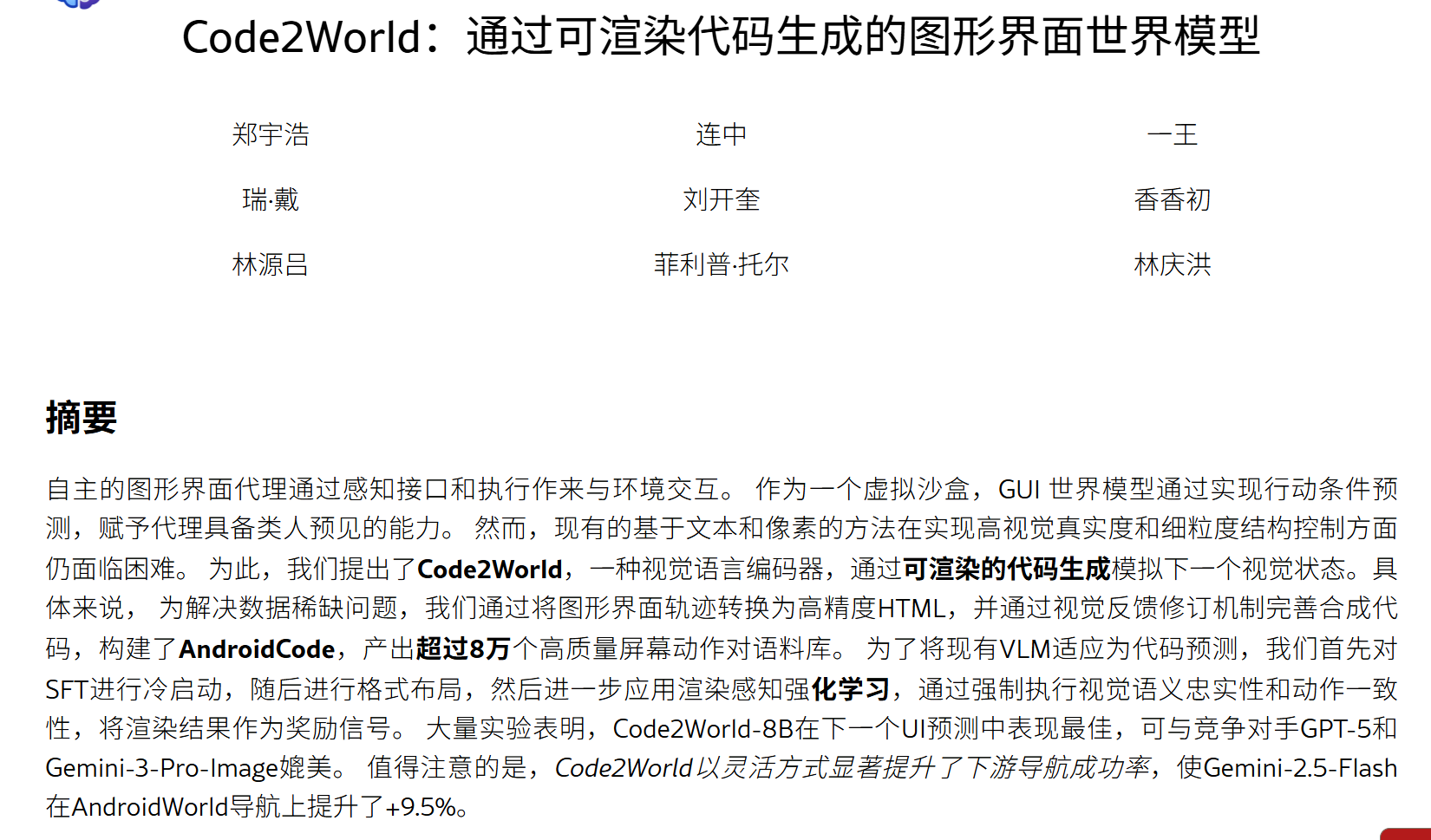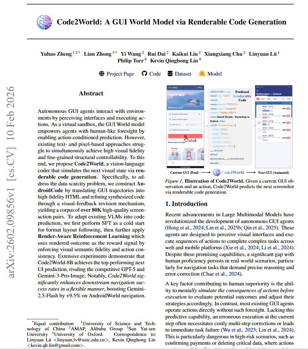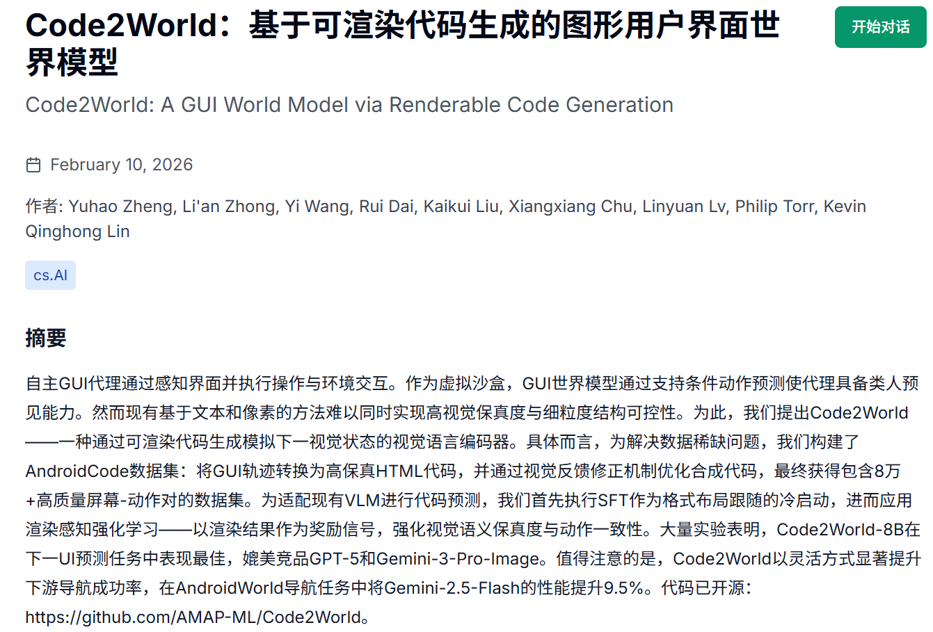 AI | 前端代码生成 SFT+RARL | Code2World: A GUI World Model via Renderable Code Generation·2026.2.10