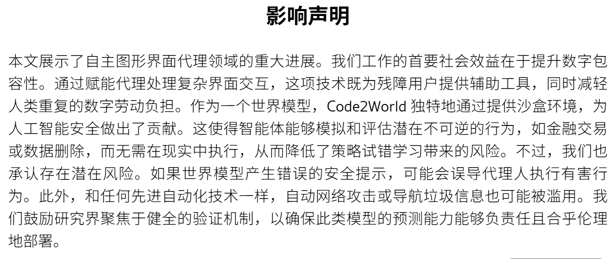 贡献:提出了Code2World,一种视觉语言编码器,通过可渲染的代码生成 模拟下一个视觉状态。
