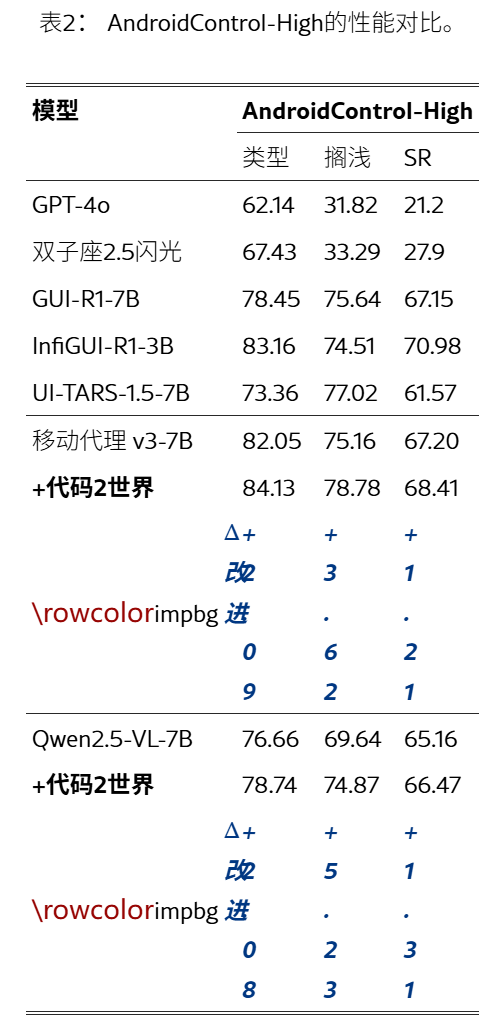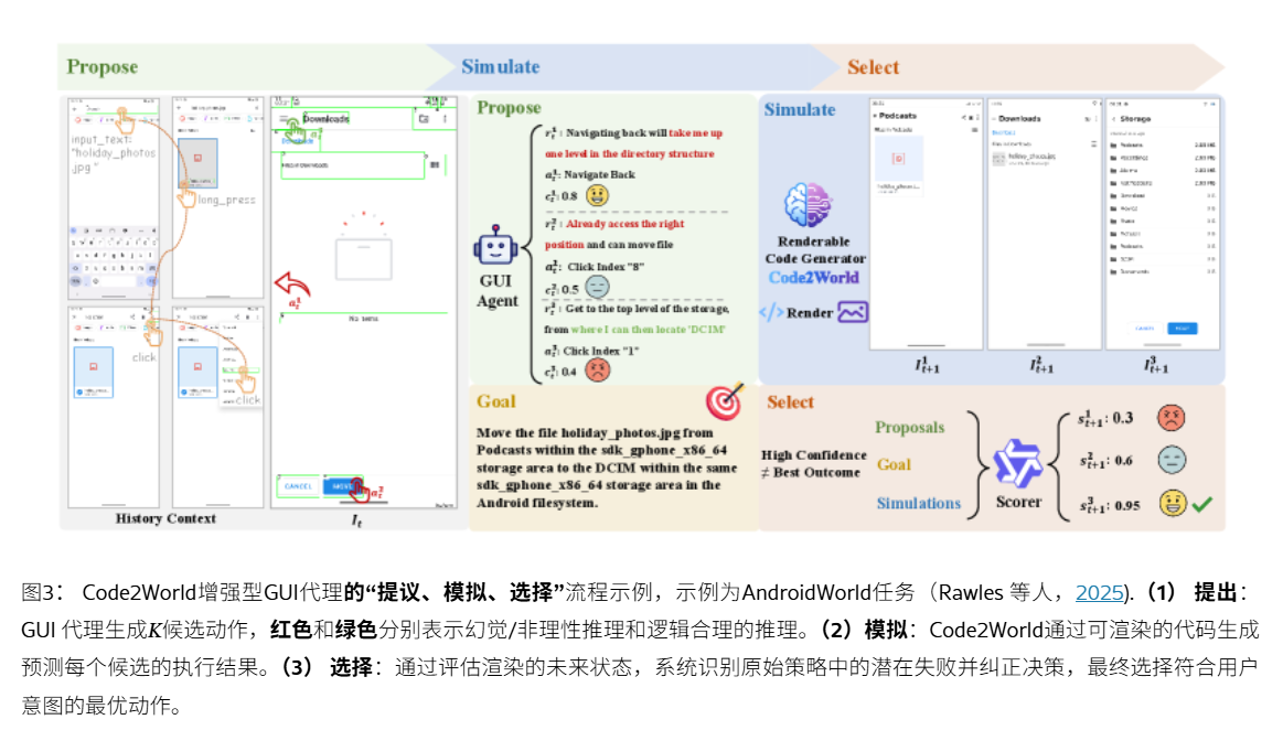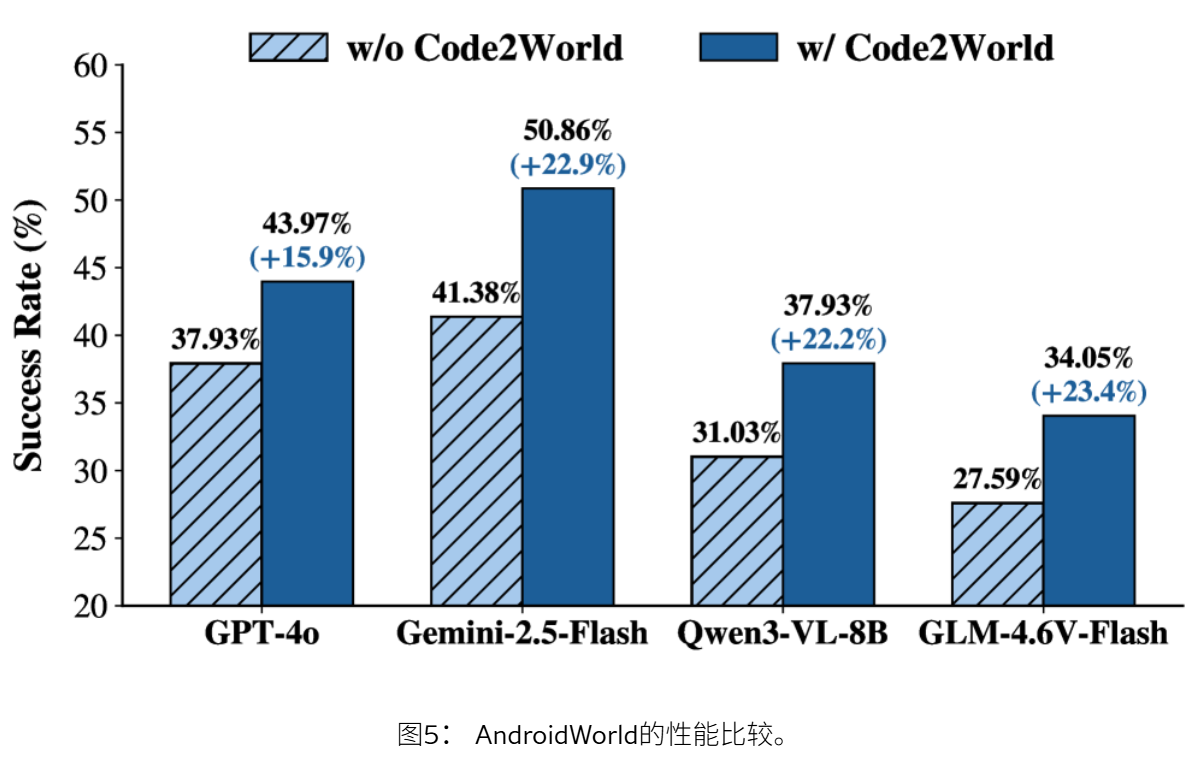 Code2World以灵活方式显著提升了下游导航成功率,使Gemini-2.5-Flash在AndroidWorld导航上提升了+9.5%。
