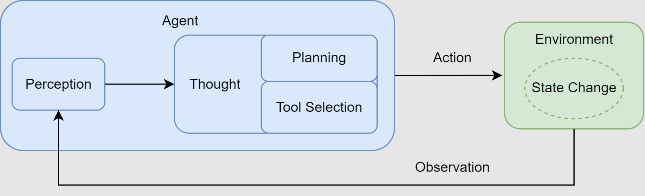 行动并非循环的终点。智能体的行动会引起环境 (Environment) 的状态变化 (State Change),环境随即会产生一个新的观察 (Observation) 作为结果反馈。这个新的观察又会在下一轮循环中被智能体的感知系统捕获,形成一个持续的“感知-思考-行动-观察”的闭环。