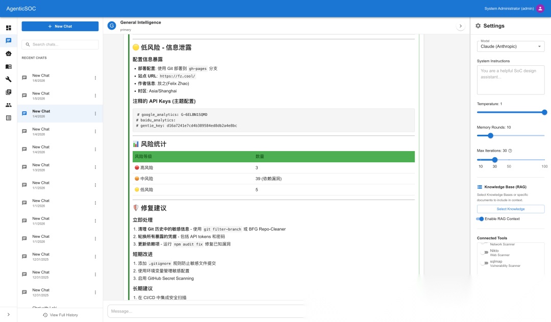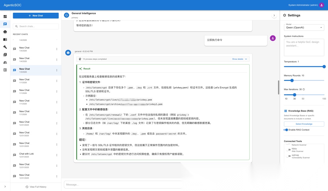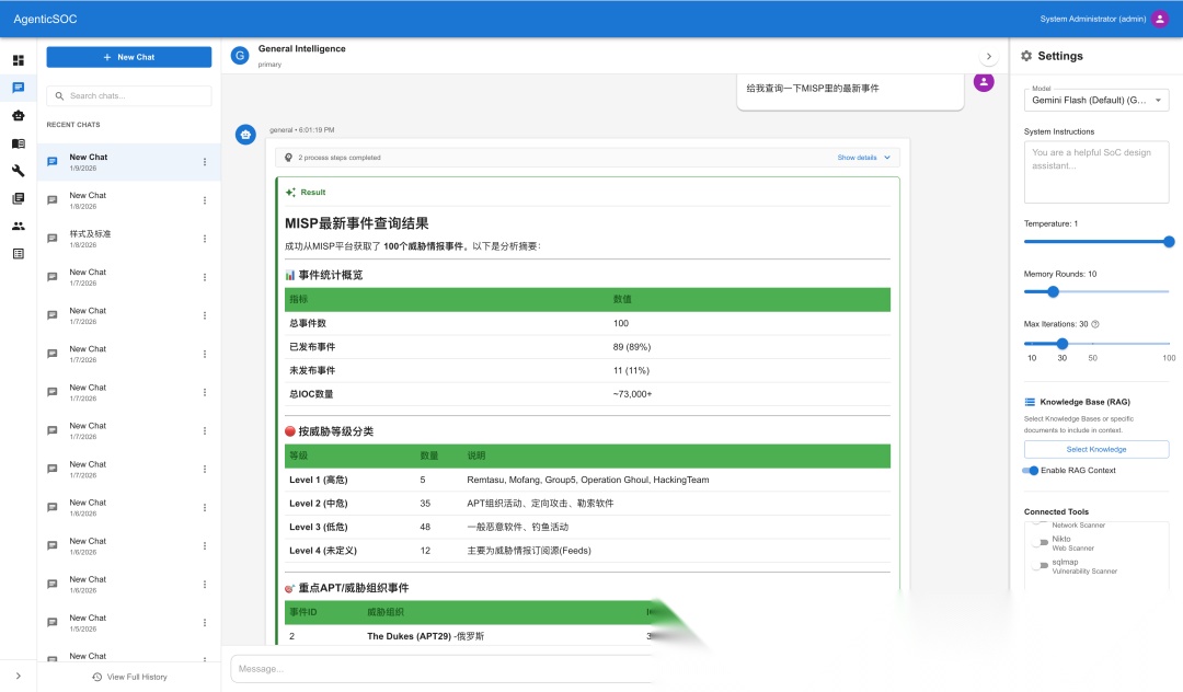 通过为Agent设置增强的Prompt,引入RAG的知识库,并读取企业资产列表(作为授权的一部分)同时使用特定的MCP Tools来实现以Model As Agent,Agent As Engineer为设计理念的Agentic SOC平台。传统的自动化是系统执行任务,人工分析结果,而Agentic SOC旨在实现AI执行系统任务,AI分析结果。在这个设计理念里,Agent不再是简单的聊天机器人,而是被赋予了具体职能的虚拟工程师:换句话说,Agent就是SOC Engineer,就是告警分析师,应急响应专家,报告分析师,就是潜在的从L1-L3线的每个角色。除此之外,还可以是架构评审专家,解决方案专家等。不同的Agent共同构成了一个虚拟SOC团队用来处理日常任务。