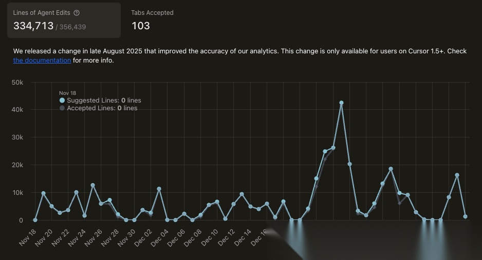 不过Cursor这个统计并不完全准确,因为除去Curosr还有不止2w行的文档和代码来自Claude CLI。但简单来看,即便Cursor有着所谓高达93.9%(334713/356439)行的Accept Rate,但实际代码却只有可怜的20%多 (8w/35w,而且实际分母应该是远远超过35w行的。剩下的都被git checkout .掉了)