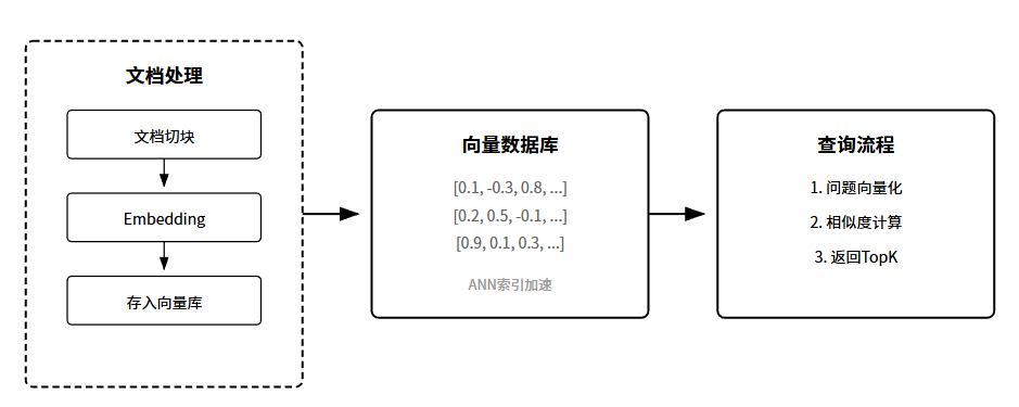 第一步,建索引。把你的文档切成小块,每块大概几百字。然后用Embedding模型把文字变成向量,存进向量数据库。这一步是离线做的,提前准备好。