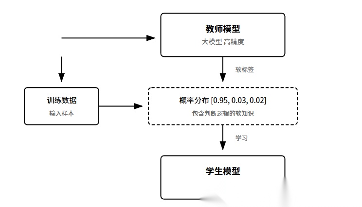 比如大模型看一张图,输出:猫95%、狗3%、其它2%。这个概率分布本身就包含了丰富的信息。小模型学的不只是答案,还有大模型的判断逻辑。