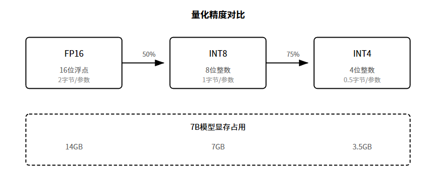 量化做的事是:把FP16降到INT8甚至INT4。INT8是8位整数,一个参数只占1字节,显存直接砍半。INT4更狠,4位整数,0.5字节,显存砍到四分之一。