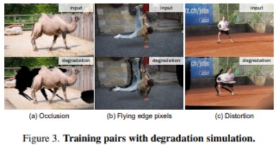 图 7表明:如果不训练模拟退化样本,生成模型会“相信条件里的几何伪影”,导致 ghosting 或模糊;加入退化模拟后,模型学会抑制伪影,并在遮挡/扭曲区域“补出更真实的细节”。