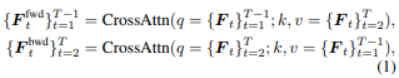 论文解释得很明确:他们显式区分 t→t+1 与 t→t−1 的瞬时运动,用双向预测来服务“时间插值”(而不只是为了多一个分支)。 公式 (1) 表明,把帧特征沿时间切成两段,分别做一次 Cross-Attention,得到前向 motion feature和后向 motion feature,分别刻画“往前一帧怎么动”和“往后一帧怎么动”。