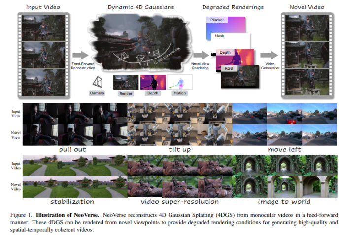 NeoVerse 的策略是把任务拆成两步:先用重建端给出一个几何上自洽的动态世界骨架(4DGS),再用生成端把“骨架渲染出来但有缺陷的画面”提升成高质量视频。