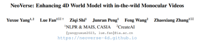 来自中科院自动化所(CASIA)与CreateAI的研究团队联合发布了最新的通用4D世界模型——NeoVerse。该模型彻底打破了以往4D建模对专业多视角数据或复杂位姿预处理的依赖,通过学习互联网上100万条“野外”单目视频,实现了从视频重建到高保真生成的跨越式进化。