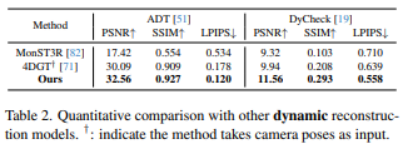 如表 2(动态),动态场景对重建更具挑战:场景中存在物体运动与频繁遮挡,模型不仅要还原几何结构,还要保证时间上的连续一致,因此更容易出现伪影或指标下降。但在 ADT 与 DyCheck 两个动态数据集上,NeoVerse 仍取得了表中最优结果。更关键的是,表注中 † 标明部分对比方法需要额外输入相机位姿,而 NeoVerse 在 pose-free(无需位姿输入) 的设定下依然优于这些“输入条件更强”的基线,从而凸显其方案在真实野外单目视频场景中的竞争力。