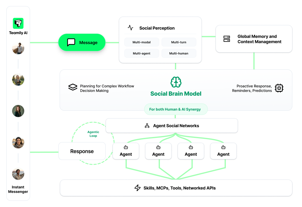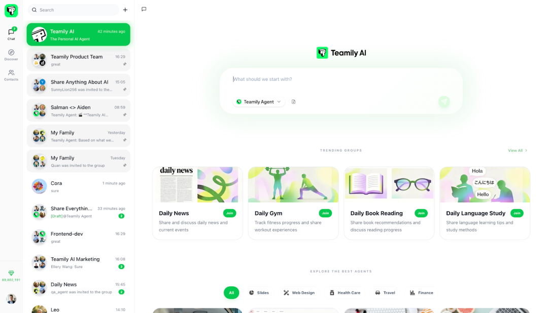 这就是初创公司 Teamily AI 最新推出的全球首个 AI 原生即时通讯应用(IM)——Teamily AI,意图构建一个人类与 AI 智能体共生的社交网络。在这个网络中,AI 不再是一个外部工具,而是群体中的一员,人类与 AI 智能体互相协作、实时共存、互动。