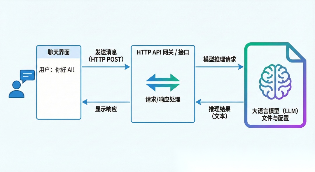 要让它工作,得有个程序把它加载到内存里,对外暴露 HTTP 接口。这个程序负责接收用户的请求,进行计算(推理),然后返回结果。这就是我们常说的推理服务。