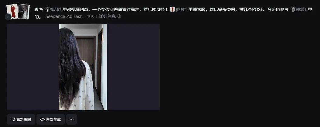- Prompt:参考@视频1里的视频创意,一个女孩穿着睡衣往前走,然后转身换上@图片里的衣服,然后镜头变慢,摆几个POSE。音乐也参考@视频1里的。