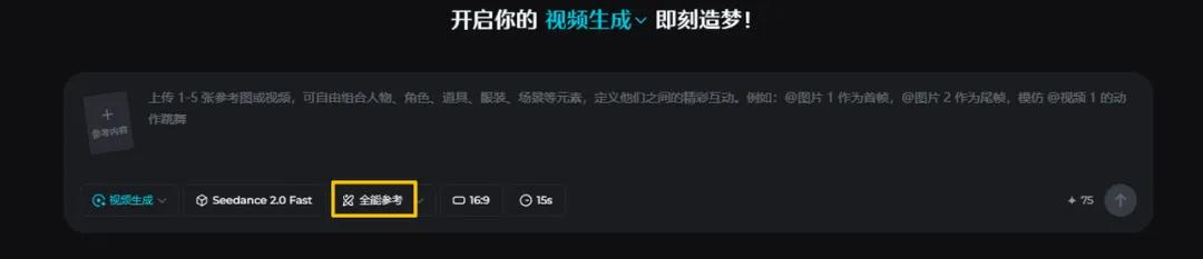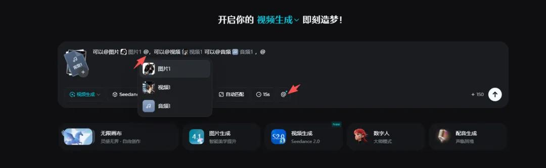 - 在全能参考模式下,直接在提示词框里输入“@”符号,就能一键唤起并调用你上传的图片、视频或音频素材,像和微信好友聊天一样简单。