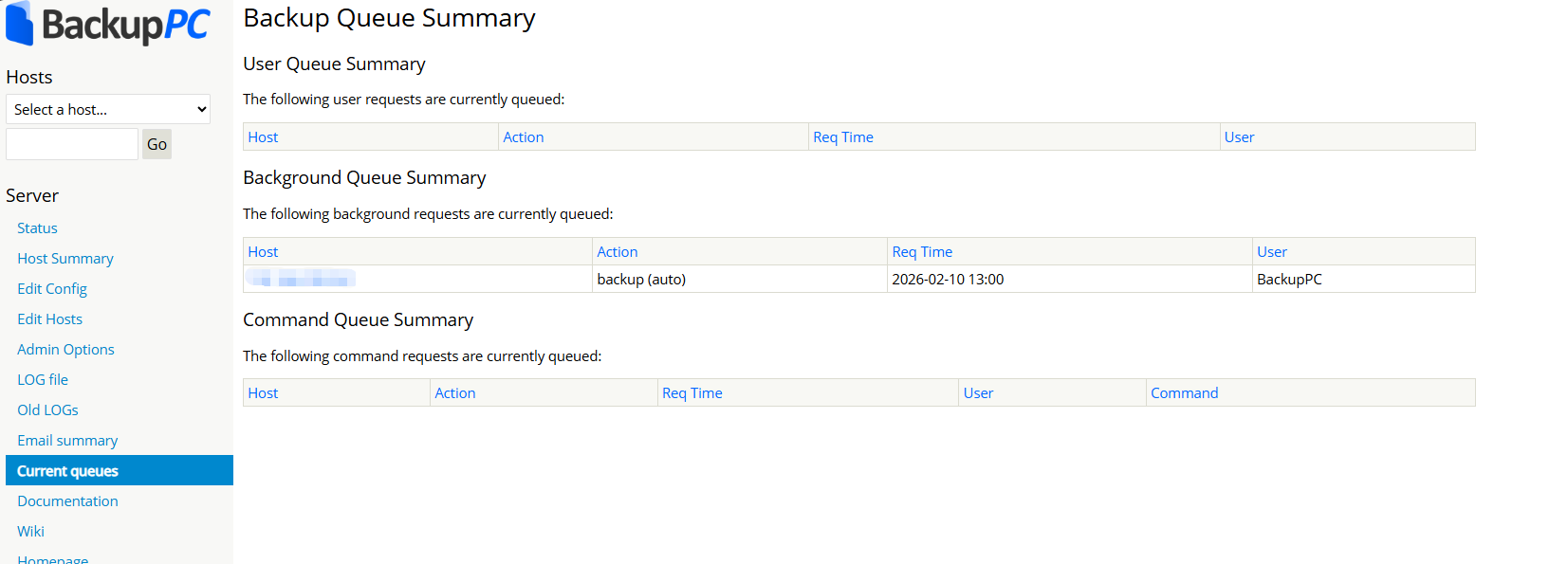这是 BackupPC 的任务队列汇总页(Current queues),核心作用是实时监控所有待执行的备份、恢复及自定义命令任务的排队状态,帮助管理员掌握系统任务负载、排查任务执行延迟或阻塞问题。