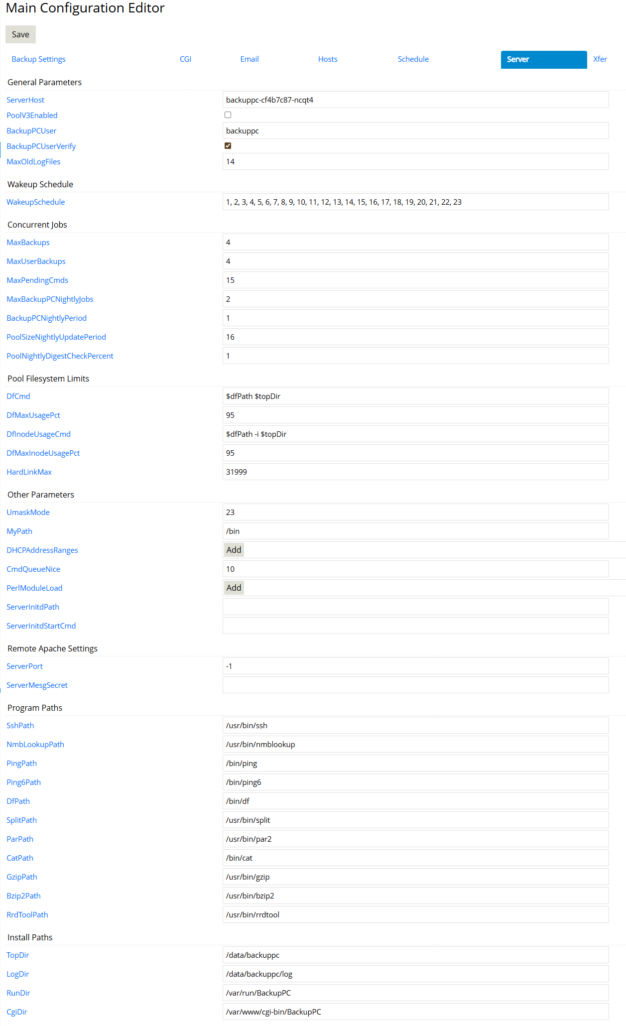 这是 BackupPC 的主配置编辑器(Main Configuration Editor),是整个备份系统的 “大脑”,用于集中管理和修改所有核心配置参数,控制备份行为、客户端交互、通知策略和服务器运行方式。