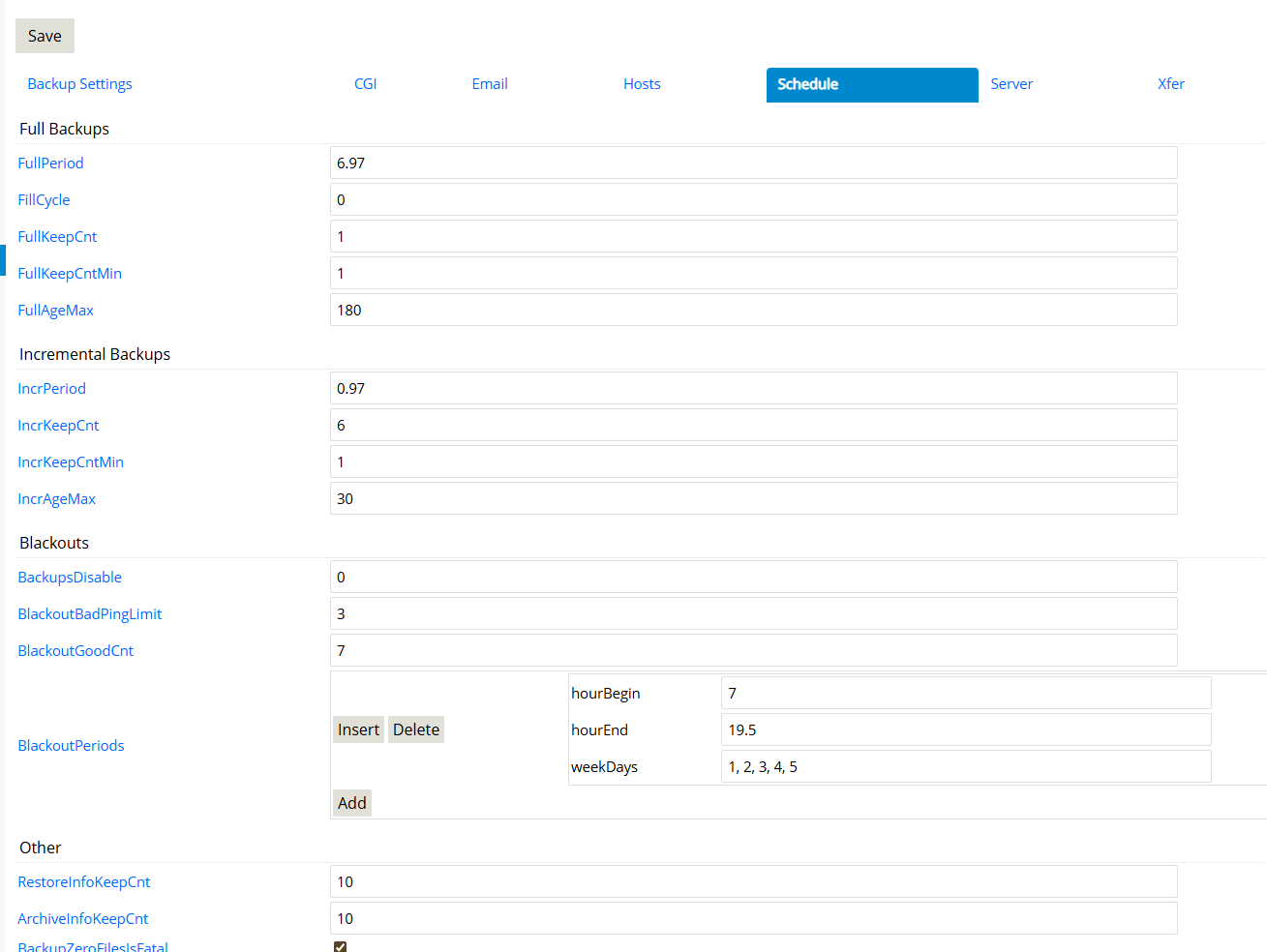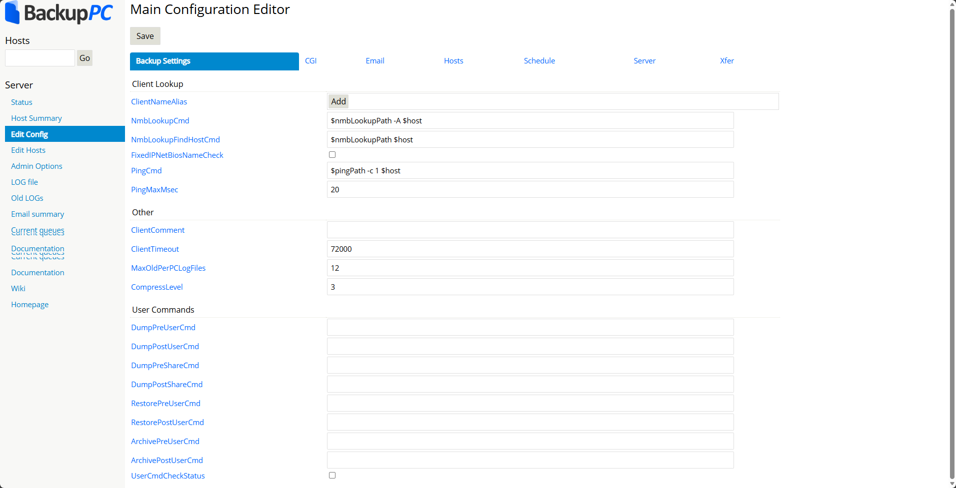 - 所有配置修改后点击 “Save” 即可生效,是 BackupPC 运维中最关键的配置入口。