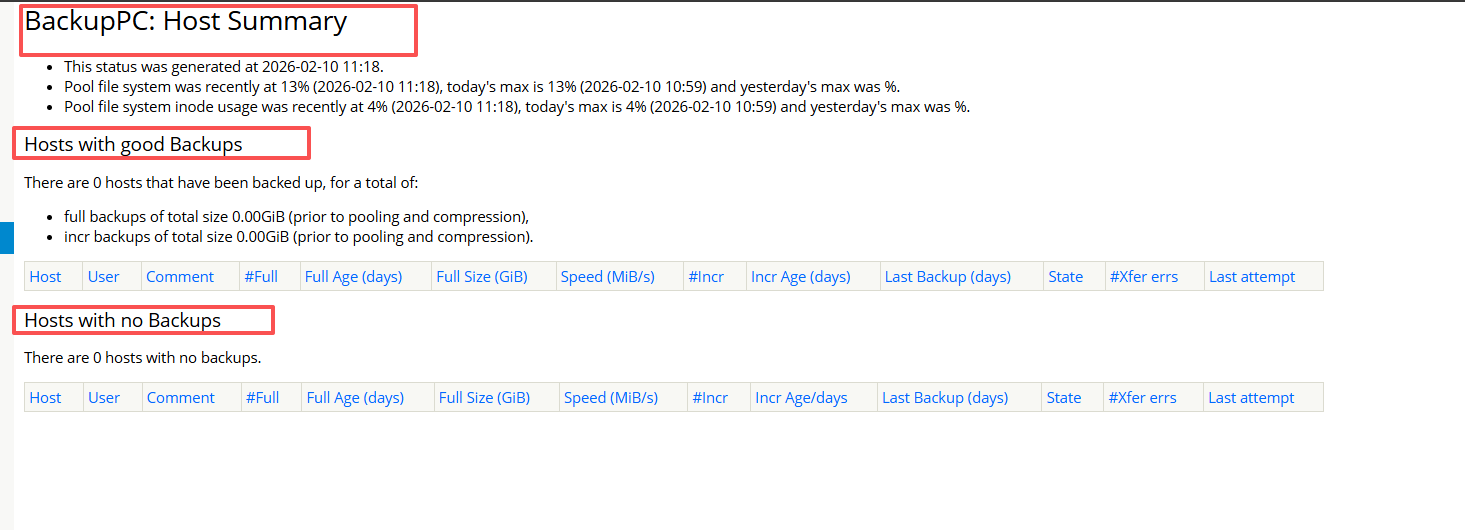 这是 BackupPC 的主机备份汇总页(Host Summary),核心作用是让管理员快速掌握所有被管理主机的备份状态、备份历史和服务器资源占用情况,从而评估备份策略的执行效果并识别潜在风险。