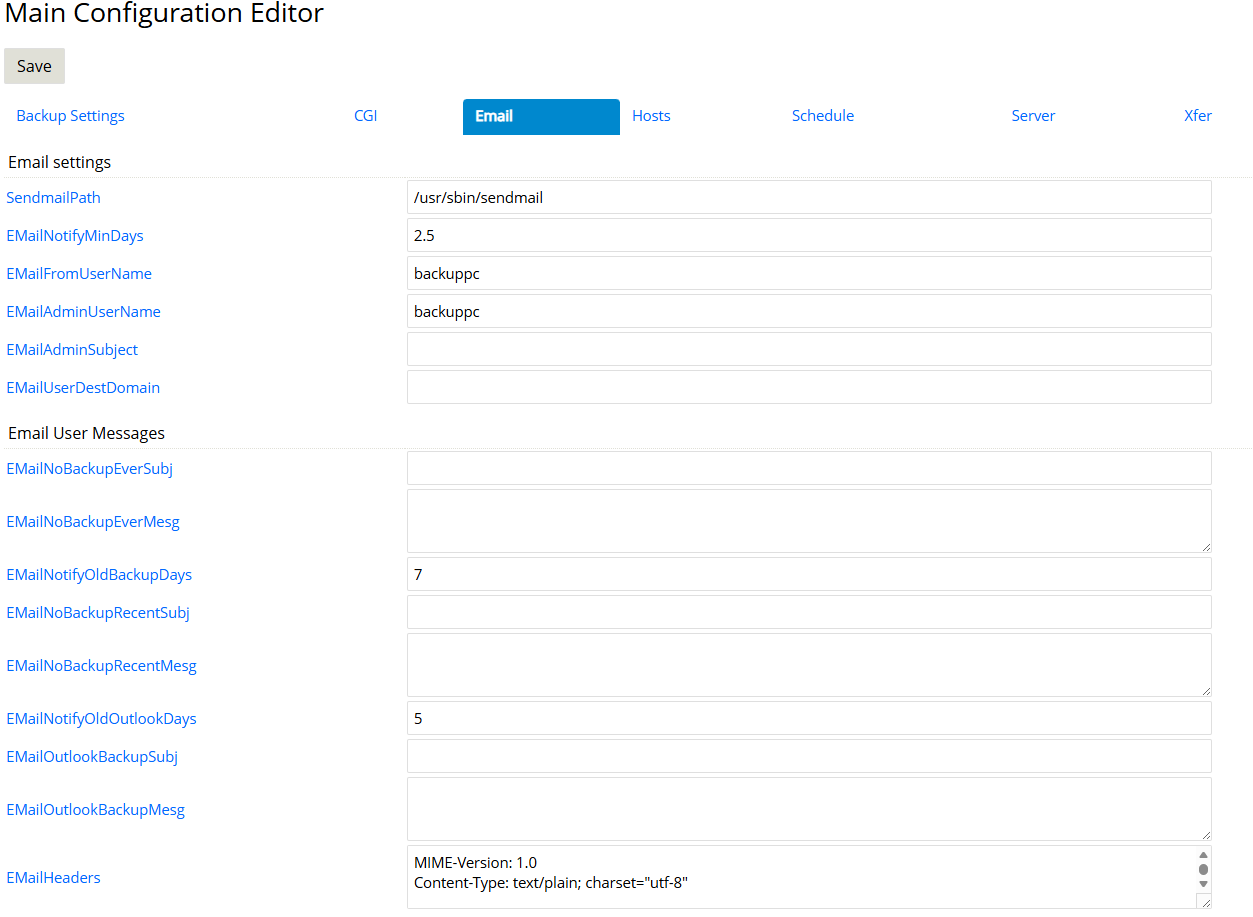 /usr/sbin/sendmail),BackupPC 会调用该程序来投递通知邮件。 - EMailNotifyMinDays:最小通知间隔(2.5 天),避免因频繁触发条件而发送大量重复邮件。