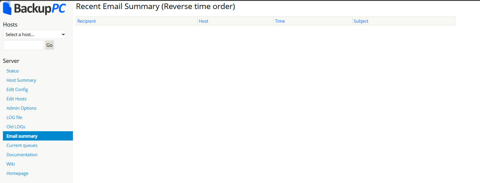 这是 BackupPC 的邮件通知摘要页(Email Summary),核心作用是集中查看系统发送的所有备份相关邮件的历史记录,帮助管理员追踪通知的发送情况、定位备份异常。