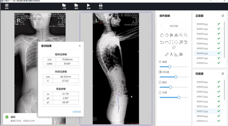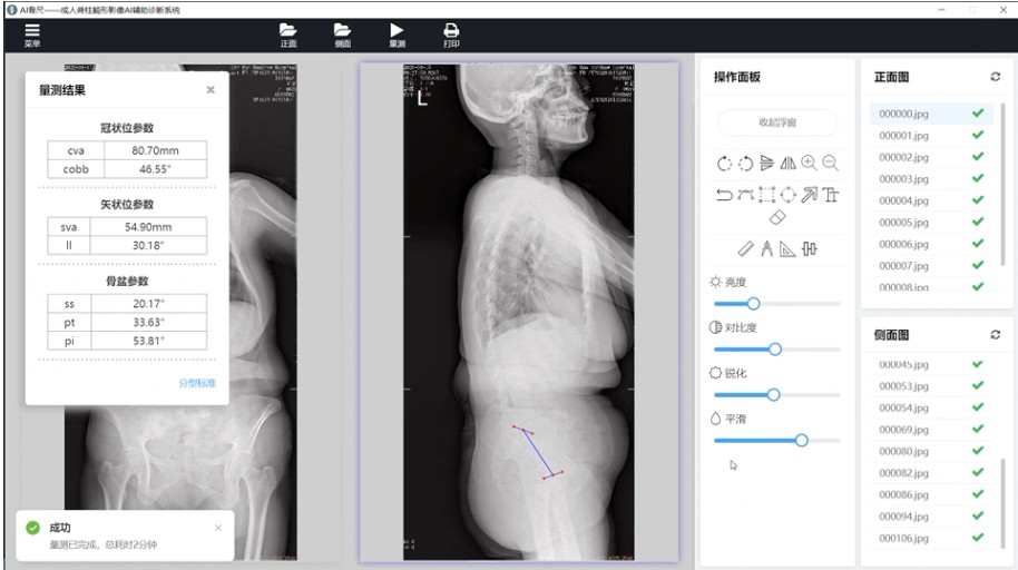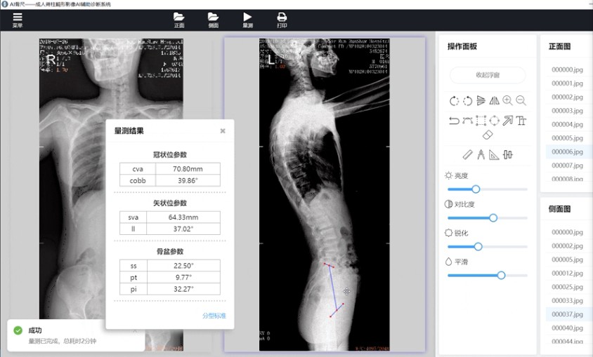 选择指定病人的影像,点击打印按钮,软件就能生成量测结果报告。报告内容包括绘制了关键点线与标注信息的病人X光片影像,以及冠状位、矢状位、骨盆参数,非常清晰直观。