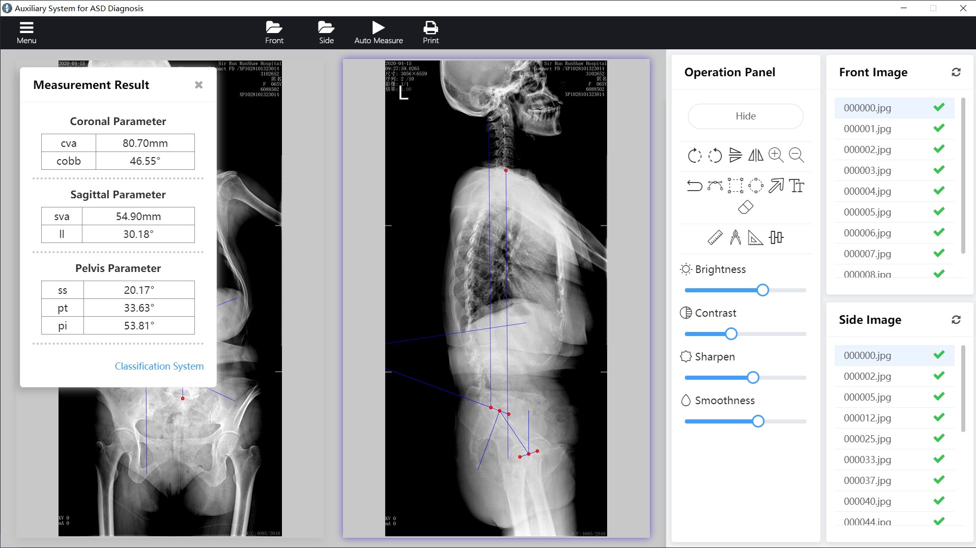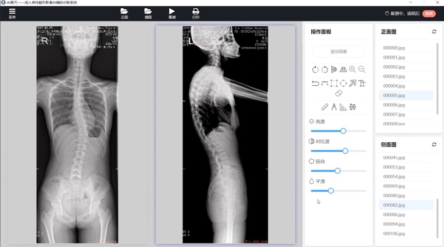 X00210-AI骨尺医学骨科影像智能量测系统Electron版本 软件基于目标检测技术,实现了脊柱力学参数的自动化测量,同时具备量测结果可视化展示、关键点位置手动调整、结果报告PDF导出等功能。 图像预处理 由于原始X光影像对比度较低且体积庞大,故采用Jimp库对原始X光影像进行统一的图像增强,采用Image-Min库对图像按一定比例进行缩放、裁剪。 量测并展示 图像上传至后端,模型检测出的是关键位置选框的坐标点,以XML的格式进行回传,由客户端对坐标进行再次的加工,计算出参数指标并进行可视化展示。 在图像显示框中绘制关键点线,并以悬浮小窗形式展现结果参数。 关键点手动调整 若用户发现量测结果有偏差,软件还提供了,对标注点手动调整的功能,拖动标注点即可改变识别位置,并同步计算出结果参数。 拖拽功能的实现采用了基于HTML5 Canvas的Fabric库。 结果PDF导出 选择指定病人的影像后,点击打印按钮,软件可生成该病人的量测结果报告,报告内容包括绘制了关键点线与标注信息的病人X光片影像与冠状位、矢状位、骨盆参数,清晰且直观。 用户可选择路径以PDF格式进行保存。