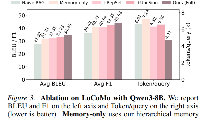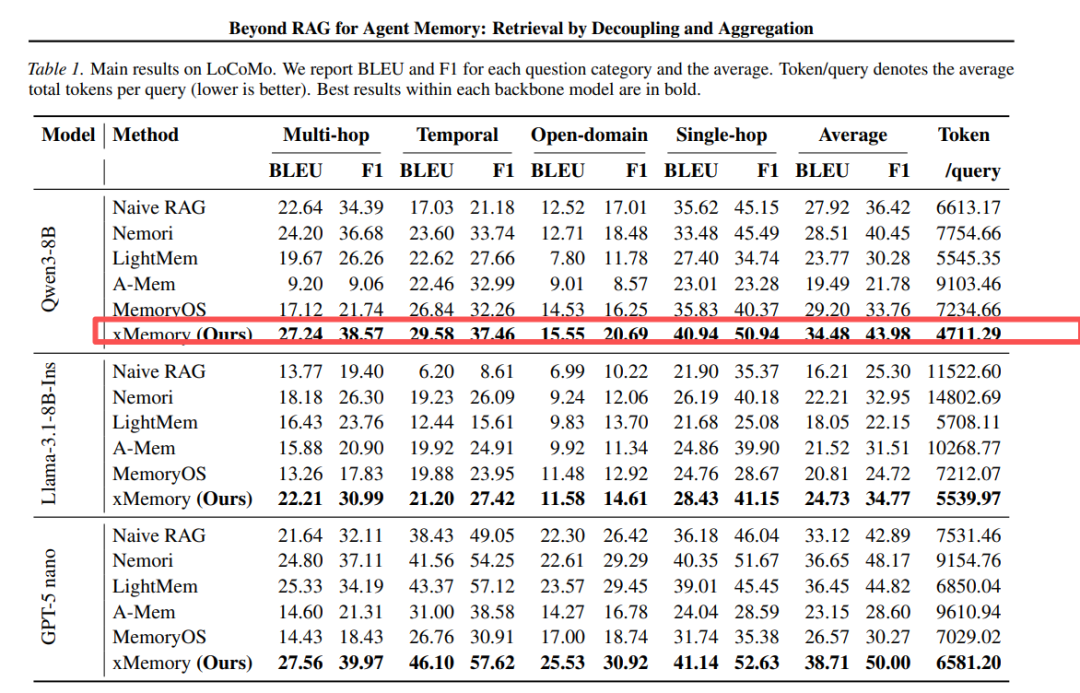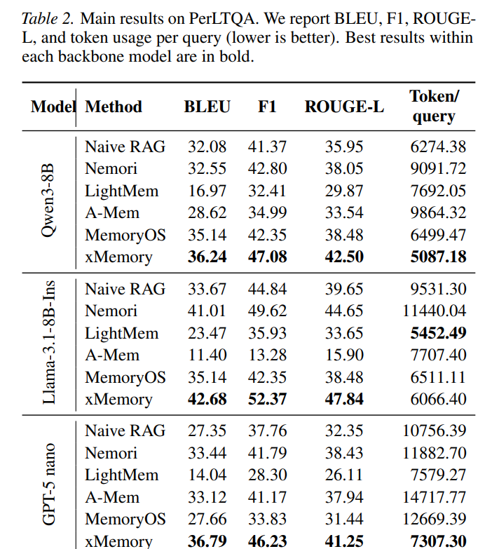 表1、表2说明:xMemory在所有三个主干模型上均取得最佳平均性能,同时显著降低Token消耗。相比A-Mem的9103 Token/Query,xMemory降至4711,性能却从BLEU 19.49提升至34.48。