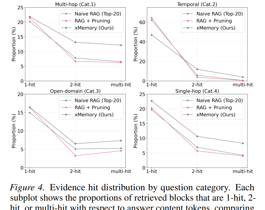 证据密度分析(图4):xMemory的2-hit和multi-hit比例显著高于RAG基线,而剪枝方法会将质量从2-hit/multi-hit推向1-hit,丢失答案承载细节。