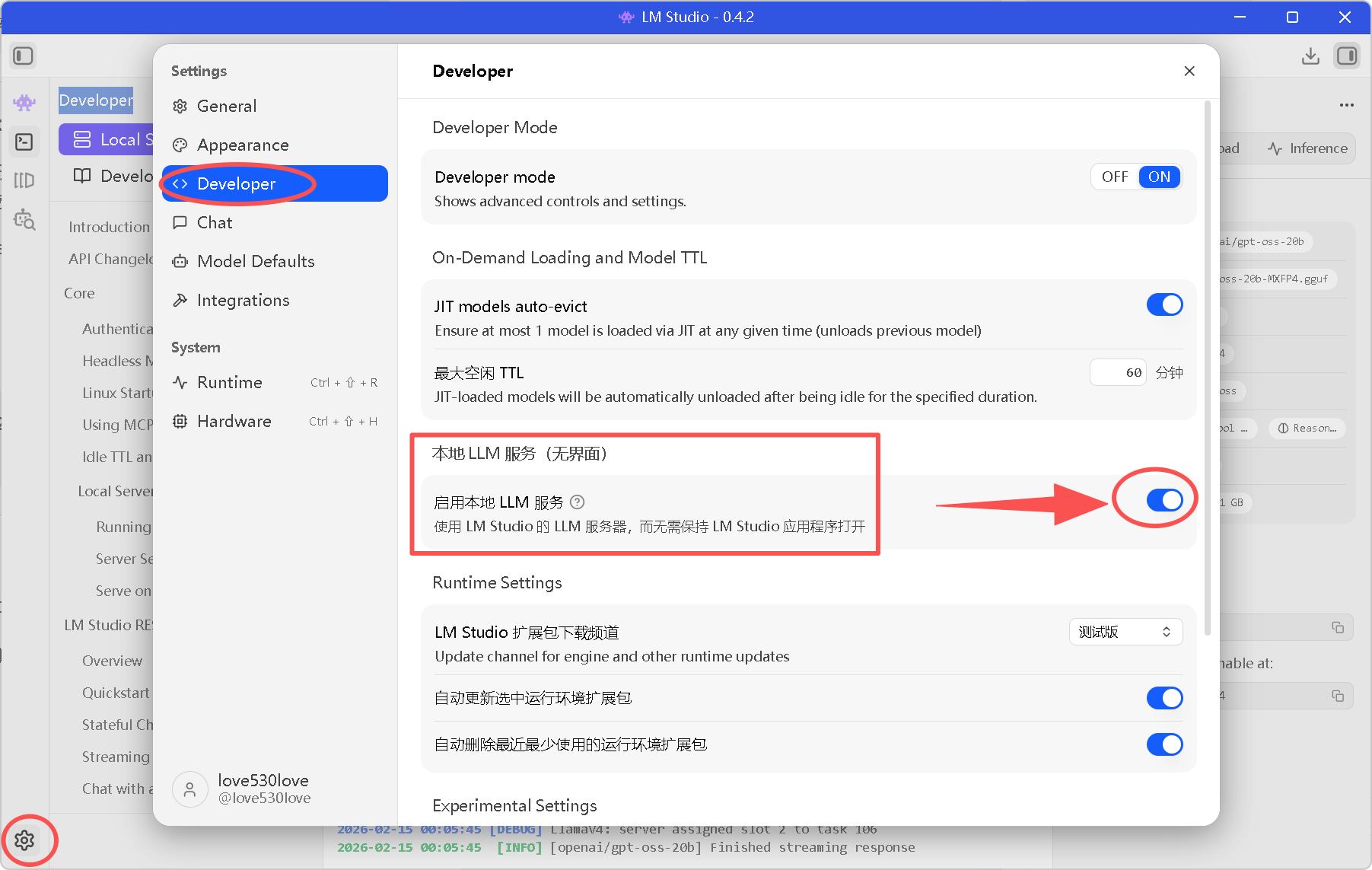 这是让 LM Studio 成为合格“服务器”的关键设置。开启此选项后,LM Studio 可以更稳定地作为后台服务运行,哪怕你不打开聊天窗口,它也能响应 OpenClaw 的请求。