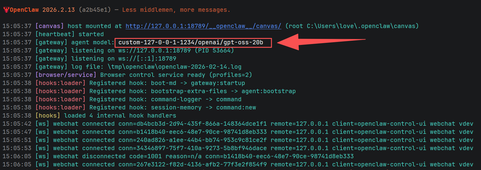 图8:OpenClaw 启动成功,监听在 1234 端口,LM Studio 模型 openai/gpt-oss-20b 已就绪。